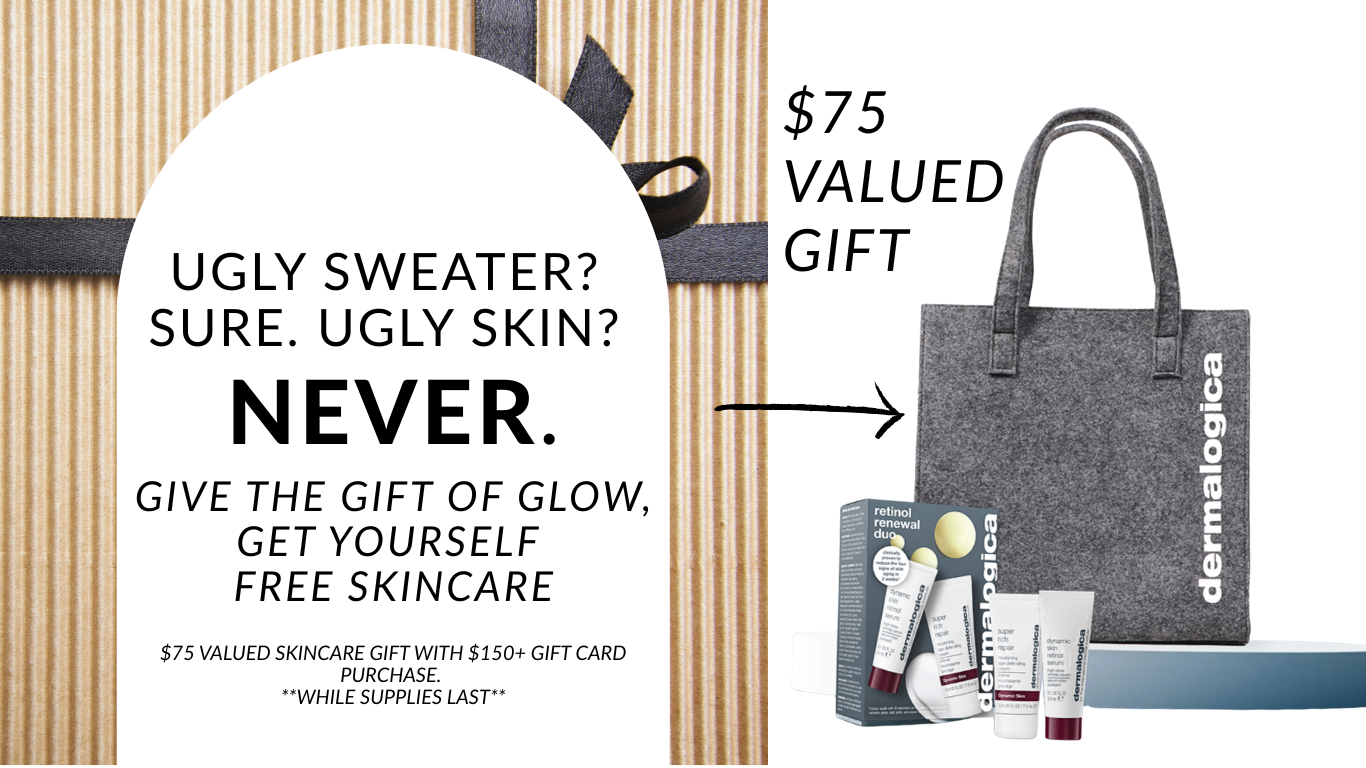 Give the gift of glow this holiday season! Purchase a gift card and receive a $75-value skincare gift, featuring a classic tote bag and travel-sized Dermalogica favorites. Hurry—while supplies last! Offers end December 31.